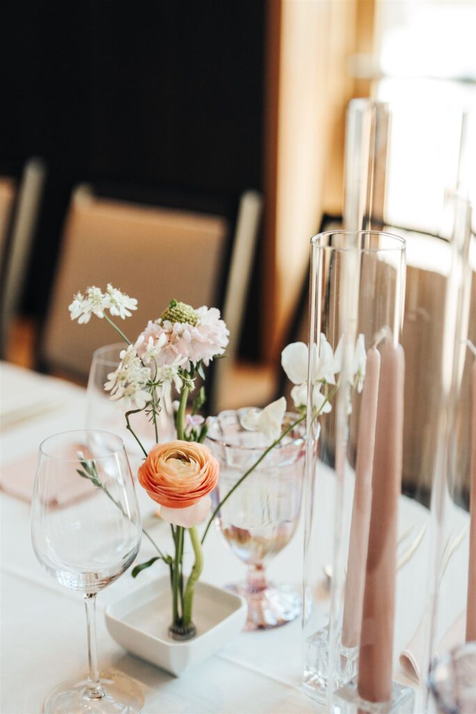 Petite ikebana inspired arrangements joined elegant taper candles on the guest tables.