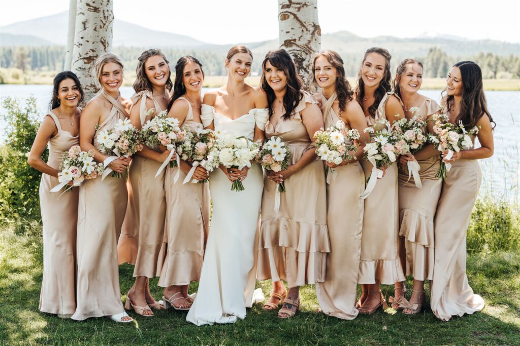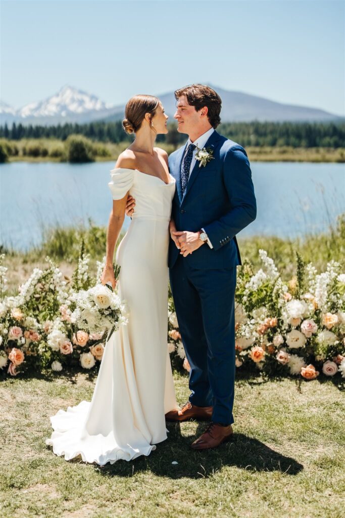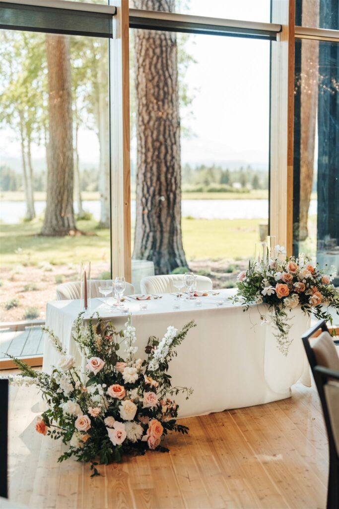 The couple was surrounded by a garden of pastel flowers for their ceremony in front of the lake at Black Butte Ranch. These pieces were later repurposed by our team throughout the reception.