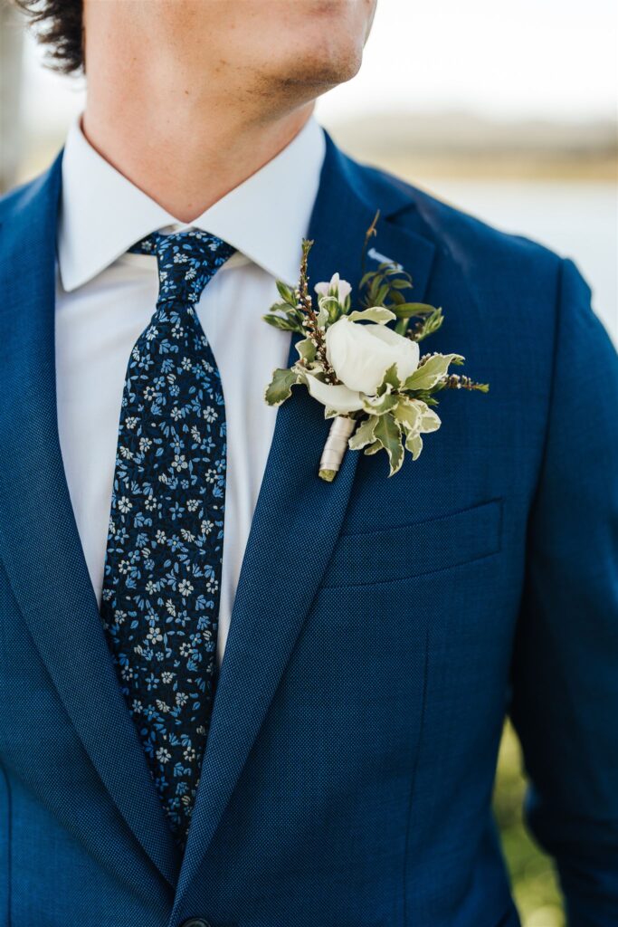 Kiernan’s boutonniere was a garden inspired mix of textures surrounding a white ranunculus bloom.